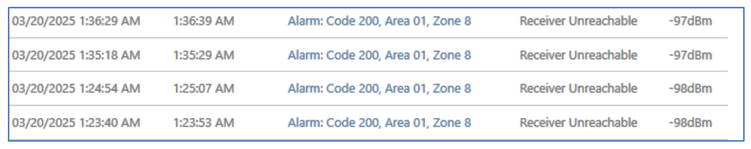 "Receiver Unreachable" in the Signal Log (example shown below) signifies the central station receiver is either not operational or malfunctioning. Contact your central station for troubleshooting. Often the issue is not with your StarLink communicator nor with your FireLink system.